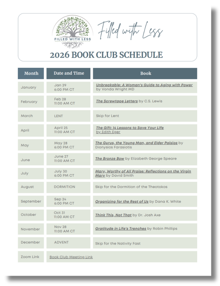 âś“ Monthly Book Selection - each month, we choose a book that aligns with our themes of faith, simplicity, and growth.